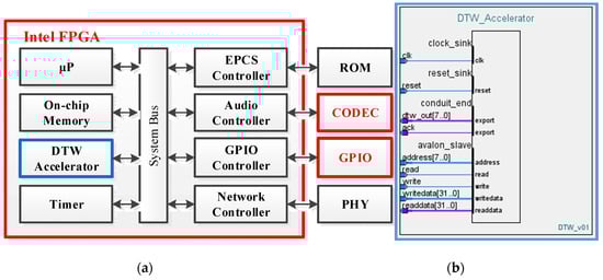 (a) Design components in the field-programmable gate array (FPGA) and (b) interface of the DTW accelerator module.