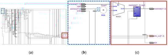 As introduced in Section 2.4, the DTW accelerator module was designed using Verilog HDL and synthesized as a FPGA design component attached to the system bus, as presented in Figure 8b. Accordingly, the DTW accelerator’s capacity can be relatively easy to extend such as bus width and register number for needs in the future. FPGA layout of the DTW accelerator is illustrated in Figure 9a. In more details, Figure 9b,c show the upper-left corner (marked with blue rectangle) and the bottom-right corner (marked with red rectangle) of Figure 9a, they respectively provide input and output interface signals as shown in Figure 8b. In which, except for the system bus interface (i.e., address, read/write data, read/write control), the signal “dtw_out[7..0]” provides an 8-bit DTW distance being valid when the signal “ack” is asserted (at high potential voltage), as shown in the bottom-right corner of Figure 9c.