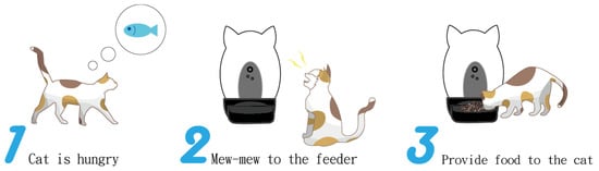 In recent years, an increasing number of people keep pets. However, they cannot feed their pets when they leave home for work. To relieve pet owners from the task of having to feed their pets, we implemented a cat voice-controlled smart feeder. The feeding flow of our system, named the mew-mew feeder, is illustrated in Figure 10 and a demonstration video link is provided on YouTube [28].