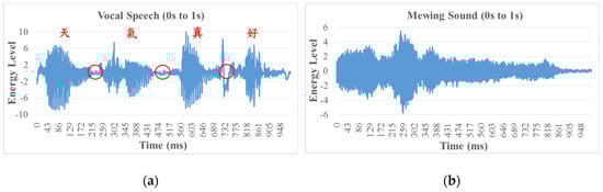 Figure 11. Voiceprint analyses of (a) vocal speech and (b) mewing sound in the time domain. - Checking whether the input signal has a valid frequency variation: We observed a frequency variation in the continuous mewing sound. Figure 12a,b presents the recorded signal in time and frequency domains, respectively. Two resonance peaks were observed at approximately 1.5 and 2 kHz. The resonance peak moved from 2 to 1.5 kHz progressively, as demonstrated in a video provided by a YouTube link [29]. To increase the recognition correctness and reduce the processing overhead in our design, if the frequency variation degree is less than 300 Hz, the input signal is regarded as a non-mewing sound and excluded from comparison with the prerecorded samples.