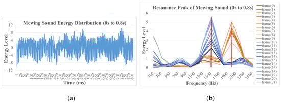 Figure 12. Voiceprint analyses of mewing sound in the (a) time domain and (b) frequency domain. - Determining whether the characteristics of the input signal are similar to one of prerecorded samples: By using the aforementioned signal processing steps, the system can accurately determine whether the input signal is the mewing sound of a hungry cat. Thus, the feeder can supply cookies to the cat, as depicted in Figure 13. A precise recognition result is a crucial design requirement for the feeder to avoid overfeeding or deprivation in facilitating the good health of the cat.
