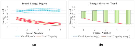 Figure 14. Sound energy analyses for vocal speech and hand clapping in (a) energy degree and (b) variation trend.