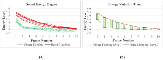 Sound energy analyses for finger flicking and hand clapping in (a) energy degree and (b) variation trend.