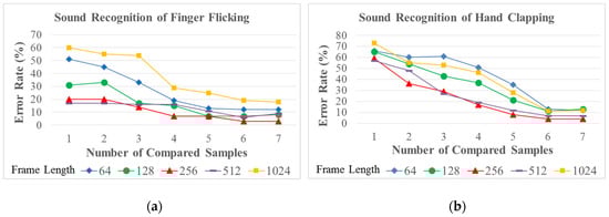 In sound signal framing, the selection of frame length (in unit of sample point) affects the result of further signal analyses. Assuming that the applied sample rate and time are fixed, a long frame length results in a small number of captured frames for the identical sample time period. In general, a longer frame could contain numerous sound characters, increasing the difficulty in observing and distinguishing specific characters of the captured frame. By contrast, when the length of the sound frame is short, the number of sample points for analysis is fewer; thus, the result is susceptible to a sudden change and is less representative of the sound signal. Therefore, the length of the sound frame is preferably determined according to the specific application, especially for nonvoice sounds. As depicted in Figure 16, for finger flicking and hand clapping, a frame length of 256 (red line marked with triangle) exhibits the best sound recognition performance (i.e., less error rates) in most testing cases. In addition, a long frame length of 1024 (yellow line marked with square) and a shorter frame length of 64 (blue line marked with diamond) cause higher error rates in sound recognition.