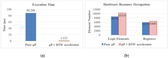 DTW processing performance comparisons of (a) execution time and (b) hardware resource occupation between “pure μP” and “μP with the DTW accelerator”.