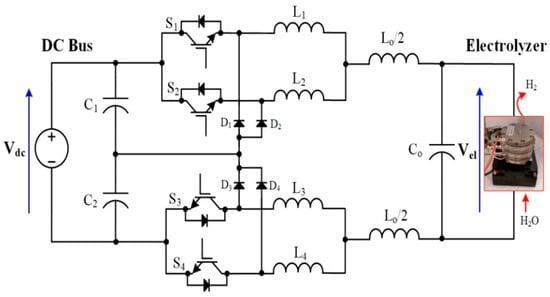 Recently, several interleaved step-down DC-DC converters have been reported in the literature and are considered as possible candidates to interface DC bus grid and ELs []. Among those possible candidates, a three-level interleaved DC-DC buck converter has been selected to realize this work. Indeed, this topology presents several benefits compared to the other reported topologies from the voltage ratio, efficiency, current ripples, and availability (in case of power switch failures) point of view [,]. For this reason, based on its features, this topology is particularly suitable for high-power multi-source systems, including renewable energy sources and hydrogen technologies. Furthermore, among the three existing types of ELs, the study is particularly focused on proton exchange membrane (PEM) technologies because of its advantages over the alkaline technology from current density, energy efficiency, and dynamic operation (mandatory when coupling with renewable energy sources (RES) due to their intermittent features) point of view [,].