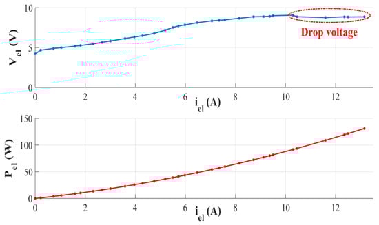 As it can be observed in Figure 3, when the PEM EL operates at a current value higher than 10 A (i.e., 0.2 A·cm−2), the stack voltage drops. Indeed, since the PEM EL stack voltage has reached its maximum value, this phenomenon may be explained.