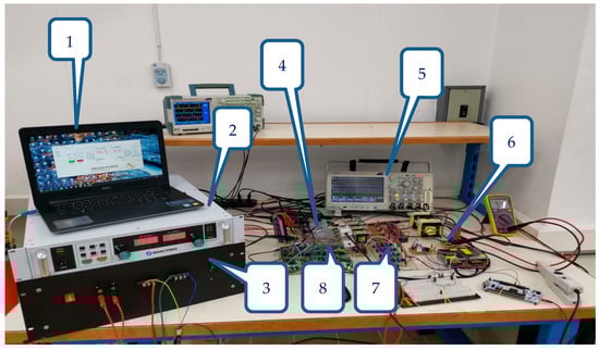 To validate the developed PI controller and the effectiveness of the converter from the voltage conversion gain and current ripples point of view, an experimental setup has been realized. The setup is given in Figure 8. It includes a laptop allowing controlling the DC power supply through a virtual control panel (1), a programmable DC power supply XR600 from MAGNA-POWER Company (Flemington, NJ, USA) (2), the PEM EL emulator (3), the developed three-level interleaved buck converter (4), a 4-channel oscilloscope (5), a voltage sensor (6), a microcontroller-based on a dsPIC33EP64GS502 (Microchip Technology Inc., Chandler, AZ, USA) (7), and driver boards (8). MOSFET power switches of the converter are controlled by four driver boards. The PEM EL emulator has been designed and realized through an equivalent electrical scheme as provided in Figure 2 []. Compared to a previous research work proposing a PEM EL emulator [], the developed emulator allows reproducing the dynamic operation of the EL as a result of step supply current. The PI controller combined with an anti-windup action (to reset the controller to avoid its saturation) of the converter has been implemented into a microcontroller from MPLAB environment. During experimental tests, the two input DC capacitors voltages (i.e., C1 and C2) are acquired by two high-voltage probes P5200A from TEKTRONIX Company (Beaverton, OR, USA); while the currents (i.e., first phase current of the converter and EL current) are acquired by two current clamps 1146B from KEYSIGHT Company (Santa Rosa, CA, USA).