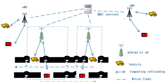 Advanced wireless broadband technology has introduced an unprecedented data traffic upgrade in the vehicular networks (VNET). This aims to improve safety and fuel economy and reduce traffic congestion in the transportation system. To cope with these challenges, the offloading of tasks to road side units (RSU) has been proposed to improve quality-of-service (QoS), although a large number of computation is carried out during difficult deadline [1,2]. Nowadays, mobile smart devices become a common tool for social networks such as entertainment, learning, and smart life [3,4]. While mobile applications continue to emerge and computing power is becoming more and more dense, due to resource constraints of mobile devices (e.g., battery life and storage capacity), the computing power of mobile devices is still limited. This makes mobile users unable to achieve the same satisfaction as desktop users [5]. A more effective way to improve the performance of mobile device programs is to offload some of their tasks to the remote cloud [6,7]. However, the cloud is usually far from the mobile device, resulting in long data transmission delays between mobile devices and unpredictable results [8,9]. This is not good for mobile device programs that respond immediately. Time is of the utmost importance to mobile users, such as augmented reality apps and mobile multi-player gaming systems. To overcome the challenges mentioned above, mobile edge computing [10,11] (MEC) enables mobile devices to access their internal applications and serve a variety of wireless access networks [12,13]. This approach also enables computing tasks from the core network to be transmitted to the edge network to reduce latency. In view of some characteristics of MEC technology, multiple types of access technologies have been allowed, so vehicles can access MEC servers through various base stations (BS), such as Wi-Fi access points (Wi-Fi APs), RSU, and evolved NodeBs (eNBs).