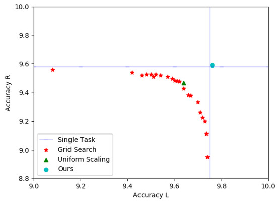 We used PyTorch to do the experiment [38]. The learning rate was set as , and we selected the model’s learning rate that produced the highest validation correctness. We used momentum SGD. We halved the learning rate for every 20 generations, and we trained 50 times with the batch size 128. We describe the performance graph as a scatter plot of the accuracy of Task-L and Task-R in Figure 3. Our scatter plot describes the accuracy of detecting the left and right digits of all baselines. This grid shows the capacity of the computing task to compete for the system model. Our approach is the only one that embodies a solution that is as good as training a dedicated model for each computing task and is better at the top right. Table 1 shows the performance of the MTS algorithm on MultiMNIST. The single task basis can solve a single task independently with a dedicated model. The results also show that our method can find a solution that can produce as accurate solution as the single task solution. It also shows that the effectiveness of our method is as good at MTS as MOO.