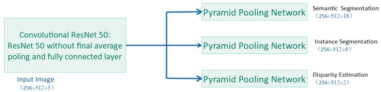 We used GRB images to implement a more realistic scene. We dealt with three tasks: instance segmentation, semantic segmentation, and monocular depth segmentation. We used a shared-special task structure. The shared task mode was based on the full convolutional form of ResNet-50 architecture [39]. We only used the layer that is better than the average pool with full convolutions. For the special task form, we used the pyramid pooling module [40] and assigned the output scale to for semantic segmentation, for instance segmentation, and for monocular depth segmentation. For the loss function, we used the cross entropy with the softmax function as the semantic segmentation, the MES for the depth and instance segmentation, as shown in Figure 4.