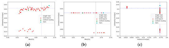We used pre-training on ImageNet [41] to initialize the shared task model. We applied an application of diamond pool network with bilinear interpolation that was also used by Zhou et al. [42]. Cityscapes measure set are usually not available. Thus, we used a verification set as the report result. For a validation set with hyperparametric search target, we randomly selected 260 images in the training targets. When choosing optimal hyperparameters, we used the full training target set to do retraining, kept our algorithm hidden during training and hyperparameter search, and reported measure results on Cityscapes validation set. For semantic segmentation, we measured it by mean intersection over union, and for instance segmentation we used MES. For semantic segmentation, we did not perform the cluster operation further, but reported the test results directly in the proxy task. In our experiment, we searched through the learning rate set and selected the model with the highest verification accuracy. We halved the learning rate for every 20 epochs, and we trained 200 times with the batch size 8. Figure 5a–c shows the performance of all baselines for semantic segmentation tasks, instance segmentation tasks, and monocular depth segmentation tasks, respectively. We used each pixel regression error to represent instance segmentation, mIoU for semantic segmentation, and disparity error for monocular depth segmentation. To convert errors of measure performance, we used 1/disparity error. We drew a two-dimensional project that represents the performance profile for each pair of computing tasks. Although we drew pairwise project for expressing visual effects, each point in the graph solves all computing tasks, and the top right is better. Table 2 shows the performance of MTS performance in three different instances. It also displays each task pair’s performance, even though we performed all tasks simultaneously on three baselines.