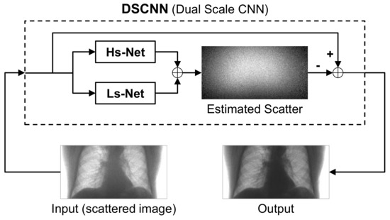 The DSCNN consists of two separate branches, Hs-Net and Ls-Net, which were designed to estimate the high- and low-frequency components of scatter, respectively. The two components were separately predicted in the parallel branches, and then combined to obtain the overall scatter.