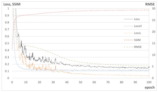 Learning curves of training (losses for training data, SSIM and RMSE for test data).