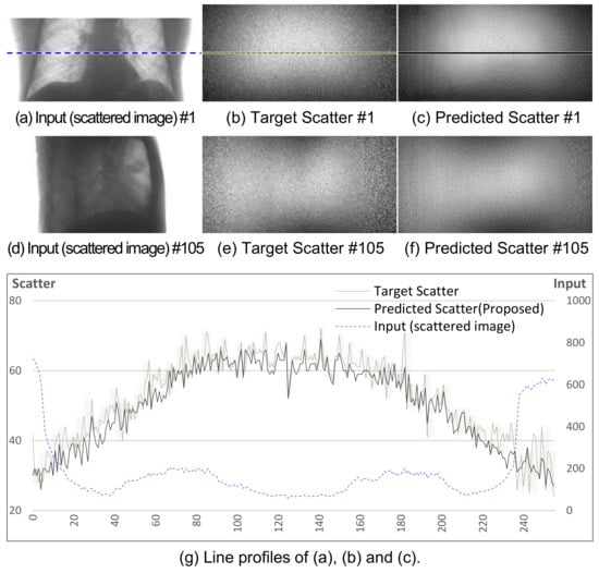 Figure 5 shows the learning curves of the training, where the losses were calculated from the training data, while RMSE and SSIM were obtained from test data. In the figure, SSIM increases as decreases, while RMSE decreases as decreases. This implies that Hs-Net contributes to the increase in the structural similarity by correcting the high-frequency component of scatter, while Ls-Net corrects the wide range of spatial scatter pattern over the entire image region. Figure 6a–f shows the two sets of sample images denoted by #1 and #105 after training. Figure 6g shows the profile of a specific row in the #1 image. The trained network generates similar scatter patterns to the corresponding targets.