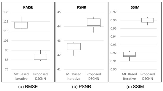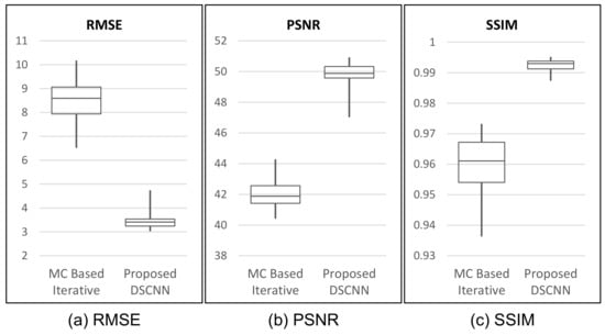 In Table 3, our proposed method shows superior performance to that of the MC-based iterative one with respect to all three indices of performance evaluation. The proposed method shows better results, with as much as 58.5% reduction in RMSE, and 18.1% and 3.4% increases in PSNR and SSIM, on average, respectively. The box-whiskers plot in Figure 7 shows that the proposed method produces a more stable result than the MC-based iterative one does.