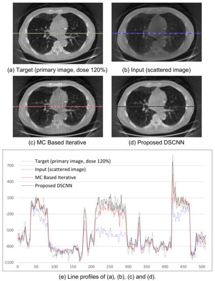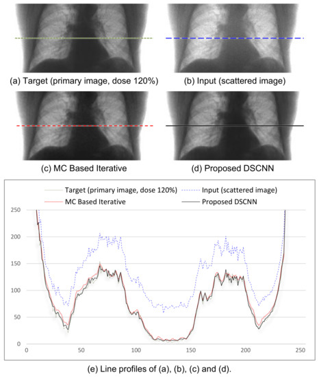 The average SSIM of 0.992 in Table 3 indicates that the proposed method can produce the scatter correction with high structural similarity with small variance. This is a required property of scatter correction, because a result with less scatter could provide additional artifacts or lose important information for medical diagnosis. Figure 8a–d shows the visual results of the two correction methods, and Figure 8e the line profiles of the four images in Figure 8a–d. Again, the proposed method predicts the target images more accurately than the MC-based one.