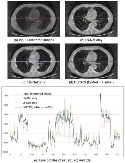 The performances of the 3D reconstructed image after scatter correction are shown in Figure 9. The images in Figure 9b–d were obtained from the separately trained Ls-Net and Hs-Net, and from the combined Ls- and Hs-Net, respectively. Figure 9b shows that a single branch of Ls-Net enhances the overall contrast of the image by compensating for the low-frequency scatter component, but generates streak artifacts due to high-frequency component of scatter and noise. Meanwhile, Figure 9c shows that a single branch of Hs-Net reduces the streak artifacts, but the corresponding profile in Figure 9e reveals the uniformity of the image is not so good. Further, relatively numerous artifacts are visibly, especially on the pathway of the X-ray beam going through thick and dense objects where severe scatter occurs. In summary, Ls-Net is suitable for correcting the low-frequency scatter component, but not the high-frequency component. Therefore, the dual-branch structure, where Hs-Net complements Ls-Net, effectively provides scatter correction, as shown in Figure 9d. Figure 9e shows the profile images of a specific line of the resulting images.