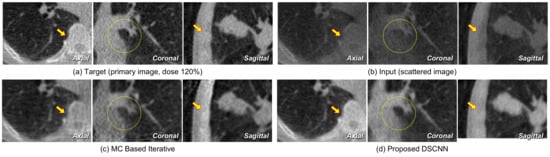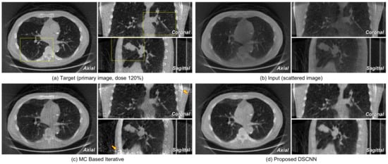 Figure 11 shows the axial images taken from reconstructed volumes with specific profile data. The superiority of the proposed DSCNN against MC-based method is evident from both the sliced image and the profile. Figure 12a,b represents the axial, coronal, and sagittal images of a target and its corresponding input scattered image, respectively. Figure 12c shows that no additional artifact is generated from the proposed DSCNN, as opposed to the MC-based iteration method in Figure 12d. However, additional artifacts are seen in the coronal and sagittal images at the arrow-indicted parts of the images from the MC-based iteration method. The regions enclosed by the yellow rectangles in Figure 12 are magnified in Figure 13. The proposed DSCNN enhances the bone boundary in the axial image (arrow), recovers the morphological information in the coronal image (circle), and well reveals the shading in soft structure in the sagittal image (arrow). The MC-based iterative method produces additional noise in the soft structure.