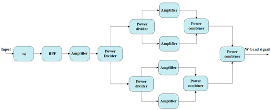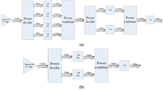 Increasing the efficiency and power capability of the frequency multiplier is the common way to obtain high output power [11,12,13]. For the diodes used in this paper, the safe input power was 24 dBm for a single multiplier. Therefore, power-combined technology was adopted to increase the effective input power. Figure 1 shows the diagram of a 335 GHz solid-state source with different schemes.
