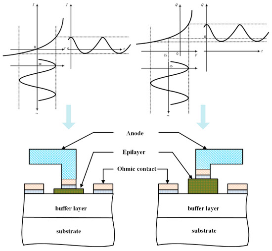The Schottky barrier diode is a two-port device that is important to terahertz frequency multipliers. The diode can be divided into two modes based on operating principle: varistor and varactor. In general, the structure of a Schottky varactor is qualitatively the same as that of a varistor diode. However, the epitaxial layer of the varactor is thicker than that of the varistor, which could increase the breakdown voltage to maximize capacitance variation [14]. Figure 2 shows the cross-sectional view of the Schottky diode. The varistor makes use of a nonlinear resistance characteristic for the mixer, and the varactor is used for frequency multipliers by using a nonlinear capacitance characteristic. The upper part of Figure 2 shows the nonlinear curves of the varistor and varactor.
