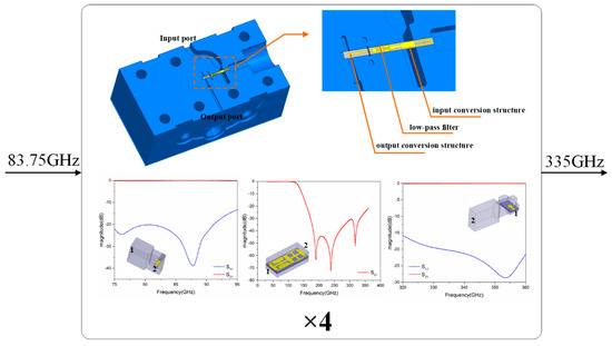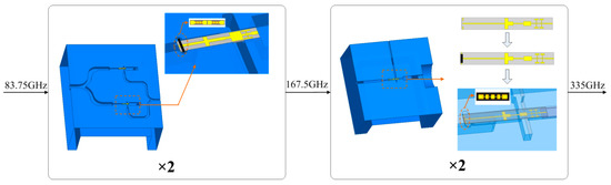The three-dimensional model of a 335 GHz source with cascaded balanced frequency doublers is presented in Figure 3. As shown in the graph, the frequency multiplier is a split-block waveguide design, and a suspended microstrip circuit based on a 50 µm thick quartz substrate is mounted in the channel between the input and output waveguide. The varactor chips are mounted on the suspended microstrip circuit with silver epoxy.