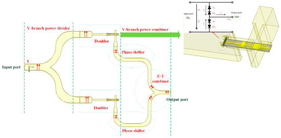 The power divider used in the 167 GHz high-power frequency multiplying source is a Y-type waveguide divider and the phase difference between the two output signals is zero. Furthermore, the second harmonic produced by the doublers has the same phase, and can be combined by using a Y-type waveguide combiner at the output ports. Figure 5 shows the phase relationship of each part in the two branches using the red arrow. Actually, the Y-type power combiner can be regarded as a combination of two-phase shifters and an E–T-type combiner, and the function of the phase shifter is to change the phase of the two-way signal from the same direction to the reverse direction for the T-type combiner.