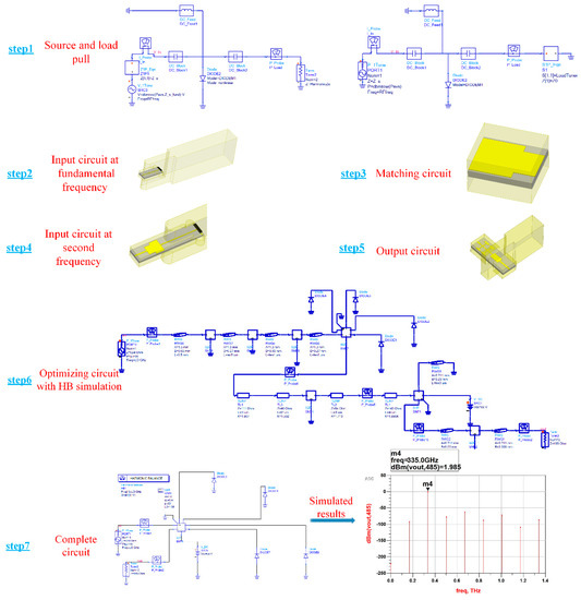The design process of the 335 GHz balanced doubler is shown in Figure 6. First of all, the impedances of the diode at fundamental and second harmonic are optimized by using source and load-pull under ideal conditions. The diode optimum impedance was found to be Zsource = 33 − j37 Ω and Zload = 16 − j23 Ω. To improve the accuracy of simulation, the field-circuit method is applied in the design process [16,17]. Hence, the doubler is divided into two parts: a linear network, which is analyzed using the finite element method in consideration of the parasitic effects, and the nonlinear behavior of the varactor solved by the harmonic balance method. To reduce the complexity of the problem, the linear part is broken up into three sections: input transition at fundamental and second frequency, output transition, and matching circuit. The signal is coupled through a waveguide-microstrip structure, and the locations of Schottky diodes junction are inserted based on the port impedances (at fundamental frequency) acquired from step 1. Generally, the length of the reduced-height waveguide and location of the input back-short are optimized to achieve a small return loss in the input port. The second harmonic passes through the region between the diodes and input back-short and then is coupled into the output line by matching circuit. Another probe located in the output circuit couples the second harmonic to the standard output waveguide. The abovementioned design process refers to steps 2–5. In the next step, the generated SNP files are imported to the Advanced Design System (ADS) circuit and the characteristic of the diode is added in the nonlinear circuit. Furthermore, the optimization procedure is achieved based on harmonic balance analysis. Finally, the three-dimensional model of the doubler is built according to the optimized results and the calculated S parameter of the complete circuit is exported to the ADS. Now, the doubler model is regarded as a 7-port network. The simulated result of a doubler working at 335 GHz is described at the right side of Figure 6. It clear that the odd harmonics are suppressed in simulation, and that the results coincide with those obtained by Equations (1)–(3).
