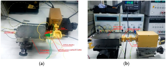 A frequency multiplier of order N converts the input sinusoidal signal of frequency F1 and power P1 to an output sinusoidal signal of frequency FN = N × F1 and power PN. Hence, the conversion efficiency of the frequency multiplier is defined as the ratio of PN to P1. For a chain (×N1×N2) of two cascaded multipliers of respective order N1 and N2, the conversion efficiency of the chain is η (N1, N2). A high-order frequency multiplier of order N3 = N1 × N2 usually has a conversion efficiency η (N3) < η (N1, N2) and η (N1, N2) = η (N1) × η (N2). Therefore, in theory, the efficiency of scheme (a) in Figure 1 is higher than that of scheme (b).