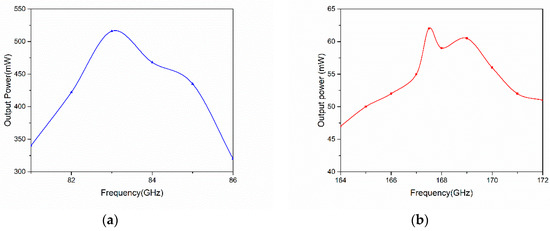 Figure 9a shows the measured results of the W-band source. The measured output power is more than 310 mW from 81 GHz to 86 GHz, and the maximum power is about 560 mW at 83 GHz. In the measurement of the quadrupler, the input power is about 200 mW to make sure the diodes work safely, and hence an attenuator is added. The measured output power of the 167 GHz power-combined doubler is shown in Figure 9b. It was found that the power is more than 45 mW at 164–172 GHz, and the highest output power is 62 mW at 167.5 GHz.