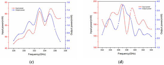 The measured results of the 335 GHz source based on two cascaded doublers are shown in Figure 9c. The measured output power of the 335 GHz doubler is more than 0.5 mW at 328–337 GHz and the maximum output power is about 1.4 mW at 333 GHz. The relation of the single-stage quadrupler 335 GHz source output versus pumping power is described in Figure 9d. The measured typical output power is 2.5 mW at 332–344 GHz, and the highest measured output power of 3.8 mW is measured at 337 GHz with an input power of 198 mW.