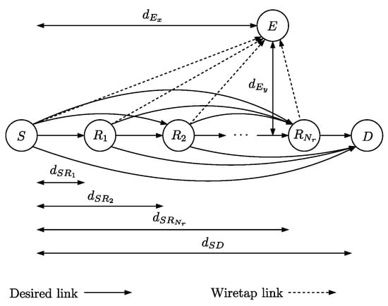For two-hop systems, cooperative networks assisted by relay nodes have been widely investigated to improve the secrecy performance of the systems [,,,,,]. For the physical-layer security of cooperative relays, a node selection method has been proposed for amplify-and-forward and decode-and-forward (DF) relaying in a two-hop system [,]. The optimal relay selection has been investigated for cooperative wireless networks with multiple relays []. Maximum ratio combining (MRC), distributed selection combining, and distributed switch-and-stay combining schemes have been evaluated for opportunistic relay selection systems [].