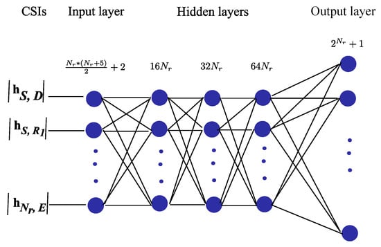 As illustrated in Figure 2, a network is designed containing five layers, which takes the absolute values of CSIs; the first hidden layer, the second hidden layer and the third hidden layer consist of , , and  units, respectively. There are  units at the output layer corresponding to  classes containing secrecy rate values of all combinatorial relay selection cases and one class presenting secrecy rate value of NT scheme. A Softmax function is applied to this layer to represent the probability distribution over all classes, and then obtain the best one with the maximum probability value. This class provides the best combinatorial relay selection or NT scheme corresponding to a given CSI.