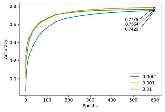 In total, 650,000 samples were generated for training data (i.e., 650,000). To select the hyper-parameters of the ANN model while avoiding the overfitting problem, 10% of these training data were used randomly for the validation phase. In the ANN model, the batch size was 1024. To ensure the best performance of the model, we trained the model with three different learning rates, 0.01, 0.001, and 0.0001. Based on the results shown in Figure 3, we can see that performance of ANN model with learning rate 0.001 outperforms that of ANN model with learning rates 0.01 and 0.0001 for a six-relay-based system. Hence, we selected the initial learning rate to be 0.001. After obtaining trained ANN model, 10,000 new samples were generated for test data to evaluate the performance of such a model.