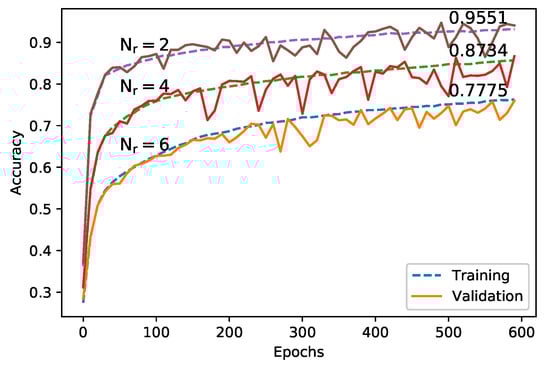 Figure 4 depicts the convergence over each training epoch on the training and validation set for three different models corresponding to the number of relays. It can be seen that all lines of accuracies of both the training dataset and validation dataset increase steadily after each epoch. Moreover, the gap between the line of training and the line of validation for each model is minimal, meaning that there is no overfitting problem. In addition, the performance of the ANN method is inversely proportional to the number of relays or input size. Clearly, the accuracy of the ANN model is 95.51% and only 77.75% with two-relay-based system and six-relay-based system, respectively.