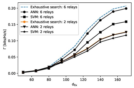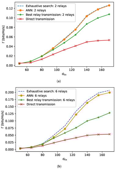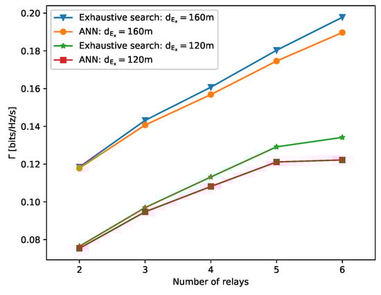 Figure 5 illustrates the achievable secrecy rate changing as a function of number of relays for positions of the eavesdropper corresponding to the horizontal axis  m and  m. In addition, this figure provides a comparison of the exhaustive search method and ANN machine learning method corresponding to different values of . The achievable secrecy rates of both the ANN-based system and the exhaustive search-based system increase when the number of relays  increases. In addition, the secrecy performance of the ANN-based system is the same as that of the exhaustive search-based system with ; however, the secrecy performance of the ANN-based system decreases when the number of relays increases (). The results also show that, with a given  distance, the secrecy performance of the system can be improved by increasing the number of hops.