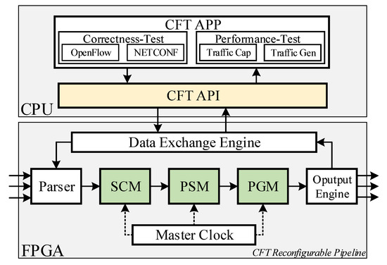 The hardware of CFT is implemented on Field Programmable Gate Array (FPGA), which is widely used in network domain innovation and new function implementation [19,20]. We implement the functions of high-speed packets generation and high-precise packets capture, making full use of the advantages of hardware in performance and accuracy. At the same time, CFT also supports nanosecond-level timestamps for some time-related tests like latency and throughput. To eliminate clock asynchronization between the control plane and the data plane, CFT novelly allows the control packets to be transmitted in FPGA to record timestamps instead of NIC, which means we combine the control plane and the data plane into FPGA. The above functions appear in the form of functional modules in a hardware pipeline in FPGA. The hardware pipeline we design uses a module reuse approach to support more test functions while consuming as little hardware resources as possible. Standard interface specifications between hardware modules help users quickly insert user-defined modules to extend new test functions. We will present more details in Section 4.