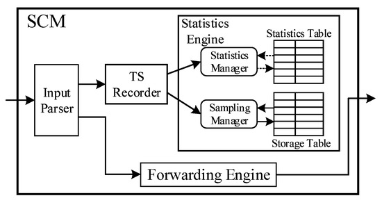 - Statistics Collection Module (SCM). SCM is responsible for recording statistic (total number of bytes, etc.) and sampling specific packets stored into a block RAM. SCM supports the nanosecond-level timestamps for input packets to calculate time-related information, such as forwarding delay.