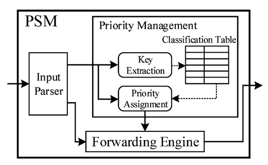 The PSM is responsible for assigning different priority values to the control plane packets and scheduling the output of the control plane packets and the data plane packets according to the proposed scheduling algorithm. As shown in Figure 4, we put forward an FPGA-based packet schedule module, which contains: