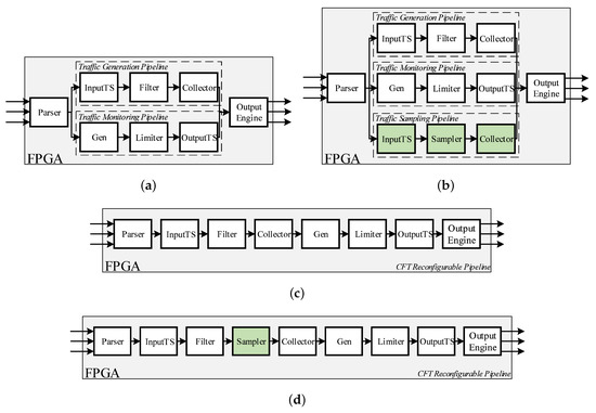 We define the specification of the interfaces between the modules in the hardware pipeline. All modules that follow this specification can be easily plugged into the hardware pipeline to provide new testing functions, which makes the pipeline scalable and expands the test coverage of the CFT. In Figure 7, we compare the hardware pipeline design of the CFT with the hardware pipeline design of existing test tools [10,19] and further compare their extensions on the new test functions. We find that we can support the new test function by inserting specific function modules that conform to the inter-module interface specification and can call the common functions by multiplexing the function modules, in the CFT hardware pipeline. Adding new test functions to existing test tools requires a new functional pipeline to be developed and a large number of hardware modules of the same function are developed repeatedly. As shown in Figure 7, when we decide to add a new test function of sampling packets in a flow, we only need to develop a Sampler module which conforms to the interface specification and insert it into the CFT pipeline. However, existing tools need to build a new functional pipeline, supporting the function of sampling. The module of InputTS and Collector are developed repeatedly, which consumes valuable hardware resources and affect the deployment of the new function. In Section 5, we demonstrate that the hardware pipeline we designed and implemented consumes as little hardware resources as possible to support more testing functions.