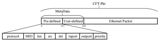 Each standard Ethernet packet that enters the CFT hardware pipeline carries its MetaData. The MetaData is a 32-bytes data which includes a 16-bytes pre-defined segment and a 16-bytes user-defined segment. The pre-defined segment contains several useful information, such as protocol type (8 bits), MID (8 bits), input port (6 bits), packet length (12 bits), etc, which enables multi-processing for the CFT-Pkt. At the same time, most modules can process packets based on the contents of the MetaData, which avoids repeated operations like parsing packets and speeds up the processing of the modules. In case that some users may have additional requirements, we reserve the 16-bytes user-defined segment for user definition. By using MetaData in our proposed pipeline, we make different modules more flexible and efficient in processing the packets.