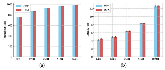 The comparison of the throughput and processing latency of Pica8 between the CFT and the IXIA is demonstrated in Figure 9. According to the results in Figure 9a, we can find that the throughput of the CFT and the IXIA is almost same, with a difference of no more than 0.1%. Since the working frequency of the CFT is 100Hz, we can find that the CFT is able to provide nanosecond-level timestamps for packets, from Figure 9b. The difference between the latencies obtained by the CFT and the IXIA is less than 1%, according to Figure 9b. Based on the above results, we ensure that the CFT has no worse performance and precision than commercial network testers.