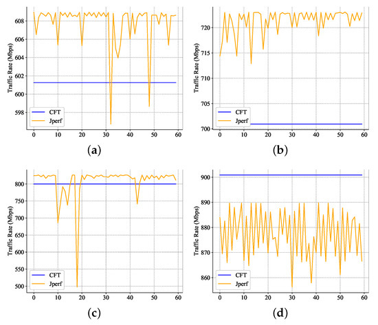 The comparison of the performance between the CFT and the Iperf software network tester at different rates; (a) traffic rate—600 Mbps, (b) traffic rate—700 Mbps, (c) traffic rate—800 Mbps, (d) traffic rate—900 Mbps.