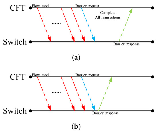 Many solutions essential for the correctness and reliability of the OpenFlow deployment rely on knowing when the SDN switch applied a given command from the controller in the data plane [13]. The Barrier message is used to tell if the command from the controller has been applied in the SDN switch. According to the specification of the OpenFlow, once the SDN switch received the Barrier_request message, it needs to complete all the transactions and send the Barrier_response message to the controller after finishing all the transactions [1]. As shown in Figure 11a, there is a time difference between the time when the controller sends the Barrier_request message and the time when the controller receives the Barrier_response message. The size of the time difference depends on the number of transactions that need to be completed. However, some SDN switches response to the controller once they received the Barrier_request message without completing the transactions, as shown in Figure 11b [9]. Therefore, in this section, we verify whether the CFT can detect the protocol correctness of the SDN switches by testing whether the implementation of the Barrier message conforms to the OpenFlow specification.