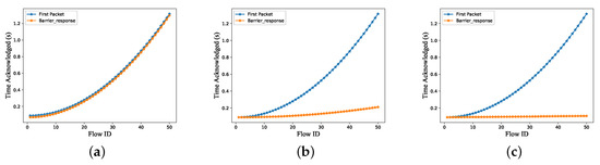From Figure 12a, we observe that the Pica8 P-3297 correctly implements the mechanism of the Barrier message, because as the number of round increases, the time at which the Barrier_response message is received and the arrival time of the first forwarded packet both increase, while the former arrives before the latter. This show that after receiving the Barrier_request message, the Pica8 P-3297 processes all the previous transactions before returning a Barrier_response message to the controller, which conforms to the OpenFlow specification. However, the OVS (Open VSwitch) and the Switch 1 do not conform to the specification because the arrival time of the Barrier_response does not increase continuously but remains constant, while the time to receive the first forwarder packet is increasing, according to Figure 12b,c. This shows that the Barrier_response is not sent after the previous transactions are processed and can not be used to confirm whether the changes in the data plane have been updated. Based on the above results, we prove that the CFT can effectively detect the protocol correctness of the SDN switch. Meanwhile, we also prove that the necessity of merging the control plane and the data plane into a single pipeline, ensuring that the time when the control plane receives the Barrier_response message and the time when the first packet is received by the data plane are both based on the same clock.