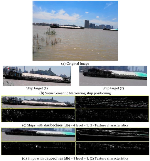 Figure 8c,d indicate that the ship has four areas, including the upper left, which is the positioning map of the ship, the upper right, which is the horizontal texture feature map, the lower left, which is the diagonal texture feature map, and the lower right, which is the vertical texture feature map. In the texture feature, the horizontal, diagonal and vertical textures of the ship are clearer than the texture of the non-ship area, so the texture feature can be observed as a unique component of the narrowing process of the subject.