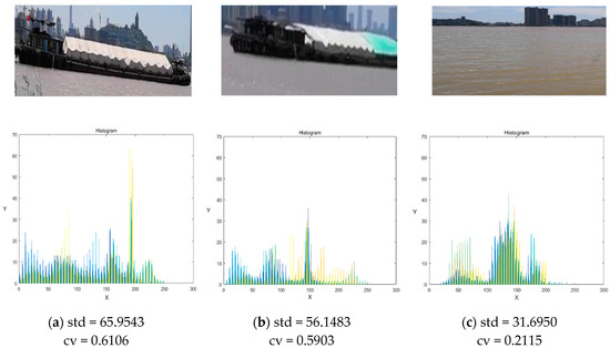 The ship has a unique feature in that it does not maintain a stable color and the area without the ship has a different color even in a small area. In other words, the ship is composed of several different colors in a small area, and this feature is called the spatial difference feature [34]. Thus far, the analysis of spatial difference features mainly originates from three methods of filter, variance/histogram and spatial wavelet. The spatial difference features used in this section are analyzed based on histograms by processing and analyzing typical color video frames. The standard deviation of the color component histograms of three different channels obtains the spatial difference characteristics of the ship's target [35]. Reviewing the literature indicates that the threshold value of the standard deviation of the green component of the histogram is standard deviation (std) = 55, while if the standard deviation of the green component of the histogram is greater than 55, the foreground target area is the ship and if it is below 55, the background is not detected as ship.