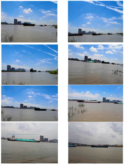 Since there is currently no public ship database, the present study utilizes the method of shooting video to collect ship data. The Yangtze River was selected as a shooting point based on field visits in various places in Jiangsu Province. According to the needs of this work, 34 videos were taken. The pixels are 1980 × 1080 with a total size of 3.58 GB. The program uses VS2015 to frame the video, extracts 30,000 multi-target images and selects 10,000 multi-target images and 2700 single-target images. The MATABLE tool is used to mark and record the position of the top left and bottom right of the image, then it is saved as mat file and txt file for later needs. After labeling, the MATLAB program is utilized to convert the .txt file into an .xml file. Finally, the data is prepared for deep learning training and the database is well established. Part of the picture labeled data is shown in Figure 11.