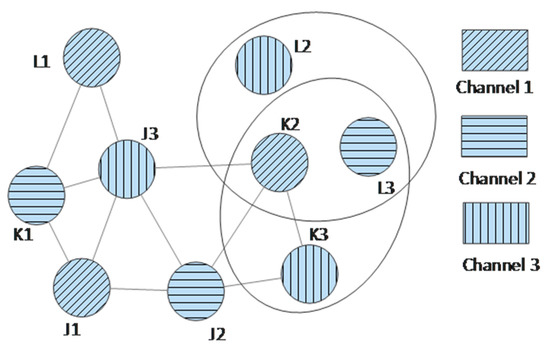 The received signal-to-noise ratios (SINRs) at the base station (BS) from the jth, kth, and lth user equipment are given by Equations (1)–(3), respectively. Let ‘x’ be a binary value which takes the value of 1 when two UEs are allocated the same resource block.