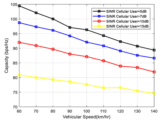 The vehicular speed vs. capacity is shown in Figure 6 under different threshold values of the cellular user (CUE) SINR. As mentioned above, the SINR threshold for the cellular user is supposed to be above a certain threshold; thus, we have taken different threshold values of the SINR—i.e., 5,7,10, and 15 dBs—and plotted the speed vs. capacity graphs. From Figure 6, it is evident that a higher CUE SINR threshold will result in a lower V2I capacity due to interference from the CUE. Therefore, a tradeoff exists while choosing the SINR threshold for the CUE.